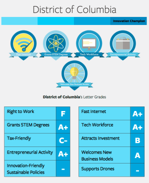 For the second year in a row, D.C. earned top grades in six of the 10 Scorecard categories, a significant achievement considering the small size of the capital district. California earned the top score for attracting investment, with over $32 billion in total funding (more venture capital and research and development funding than every other state put together), but despite being home to Silicon Valley, the state misses the mark to be included in the Innovation Champion category, due the state’s “continued burdensome regulations on energy efficiency and unfavorable tax policies.”