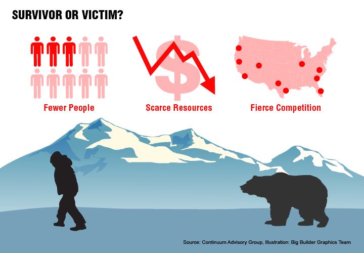 In this harsh new environment, the large organizations appear to have the advantage. Public builders are able to access public capital markets to fund expansion, can afford to pay more for top talent and can offer trade contractors larger chunks of work so that they can manage their businesses more efficiently. Differences in capital cost, availability and the need to push volume are fueling land buying binges and acquisitions of mid-sized builders in various markets across the country.