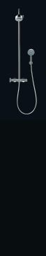 Designer Antonio Citterio works angular and rounded elements into a thinner and taller silhouette of the Axor Citterio thermostatic shower pipe, the backbone of a three-jet showerhead and hand shower.
