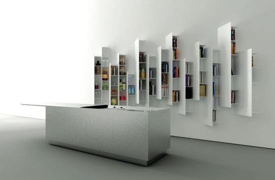 This modular shelving system mimics the lean profiles of urban skyscrapers.