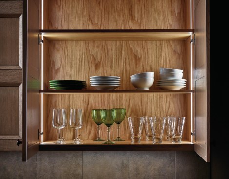 in response to the growing popularity of integrating LED lights in kitchens, Wood-Mode has launched a fully integrated custom lighting program in collaboration with Häfele LED solutions. Through a three-step process, the program assists designers with planning, selecting, and configuring designs for LED lighting, such as wire management, drivers, and switches. The program focuses on seven lighting applications including interior drawers, under cabinet, and interior cabinet.