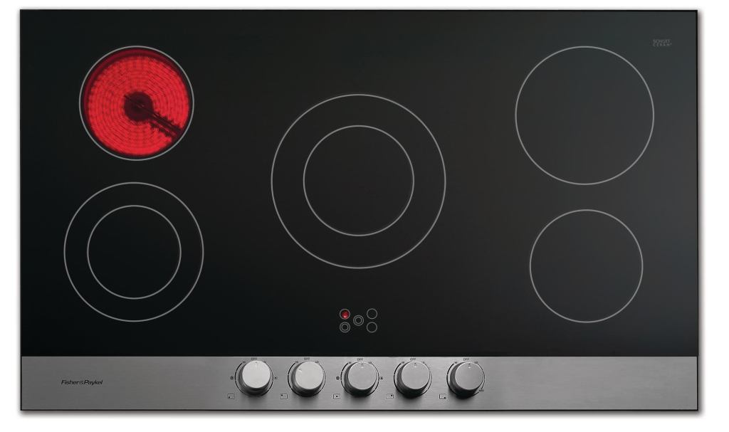High-speed ribbon elements in the 36-inch Electric Cooktop heat up fast and provide precise and even temperature control, while the SuperSimmer element prevents overcooking via ultra-low temperatures. The dark ceramic glass surface is easy to clean. Fisher & Paykel. 888.936.7872. www.fisherpaykel.com.