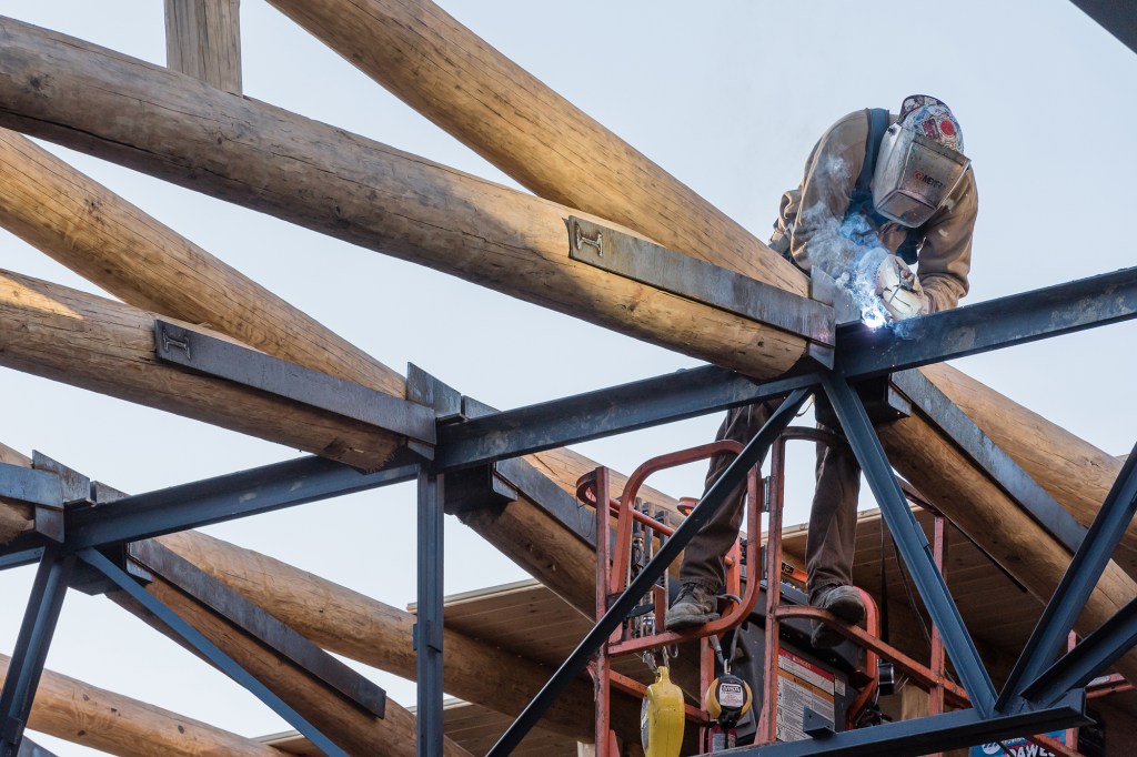 2017 Architect R+D winner WholeTrees Architecture and Structures developed a high-tension wing-truss design as part of its efforts to find applications for unmilled timber. The truss, which can bear a load of up to 800 pounds per foot, has steel connectors and reinforcements at major connection points. WholeTrees says unmilled timber has an advantage over engineered wood products because it is subject to fewer local building codes.