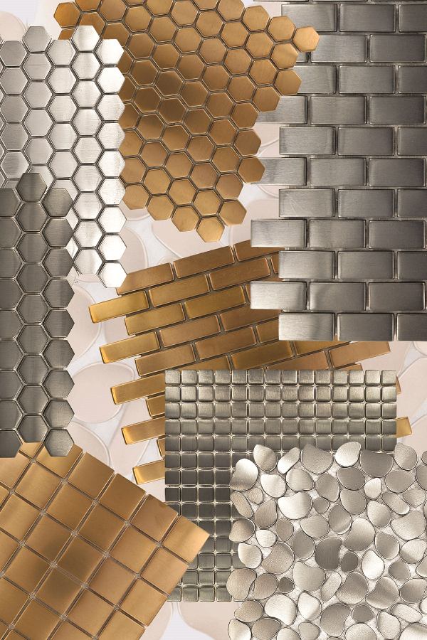 The company has addedmetal to its collection of stone tile products. Offered as a time- and cost-saving alternative to labor-intensive piecemeal tile installation, the stainless steel pieces are arranged in a pattern and individually attached to mesh sheets measuring 12 inches by 12 inches. A variety of shapes, styles, and colors is available. Cost: $14.80 to $41.10. Architectural Products by Outwater. 800-631-8375. www.outwater.com.