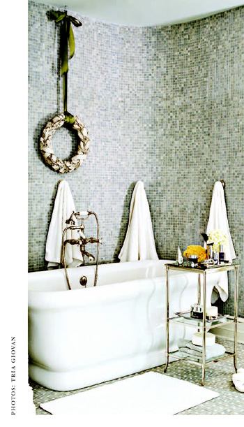 TILE STYLE How do you keep a 340-square-foot master bath from having the cavernous feeling of a locker room? Tiles by Waterworks were an important part of the solution in this home outside the nation’s capital. Designer David Mitchell specified subtle variations in tile color and pattern to create visual hierarchies and intimate interludes within the context of the larger space. For example, 4-inch-by-4-inch slate-blue glass tiles are used only on the shower wall, while iridescent gray mosaic tiles appear exclusively in the tub alcove, making it another discrete niche. A geometric floor pattern of brilliant white and moss green tiles unifies the entire room.