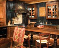 The Mountain Estates collection for kitchens, baths, and other rooms features oversized cabinetry with decorative moldings and rustic, hand-rubbed finishes in warm tones. Habersham Furniture Company. 800.422.3774. www.habershamdesigns.com.