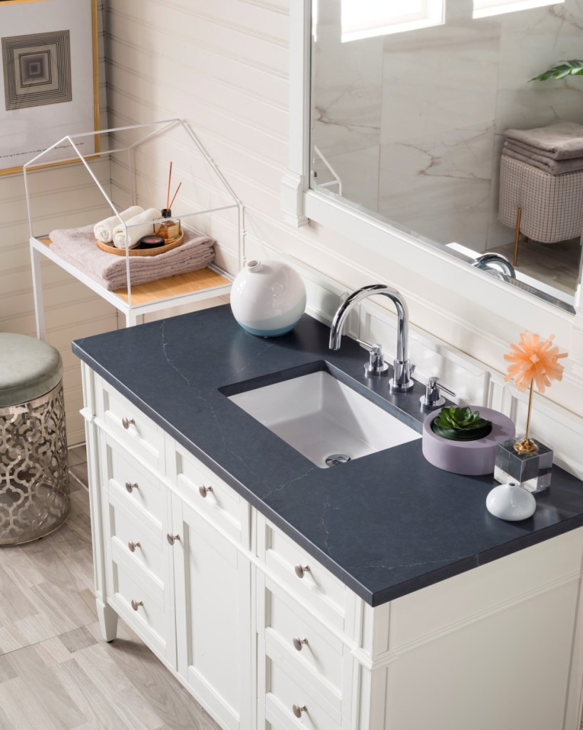 James Martin’s Silestone vanity tops measure 3 centimeters thick, and are available in five curated colors from the Eternal, Iconic, and Mythology Silestone color collections: Charcoal Soapstone and Pearl Jasmine (Eternal), Iconic Black (Iconic), and Classic White and Grey Expo (Mythology).