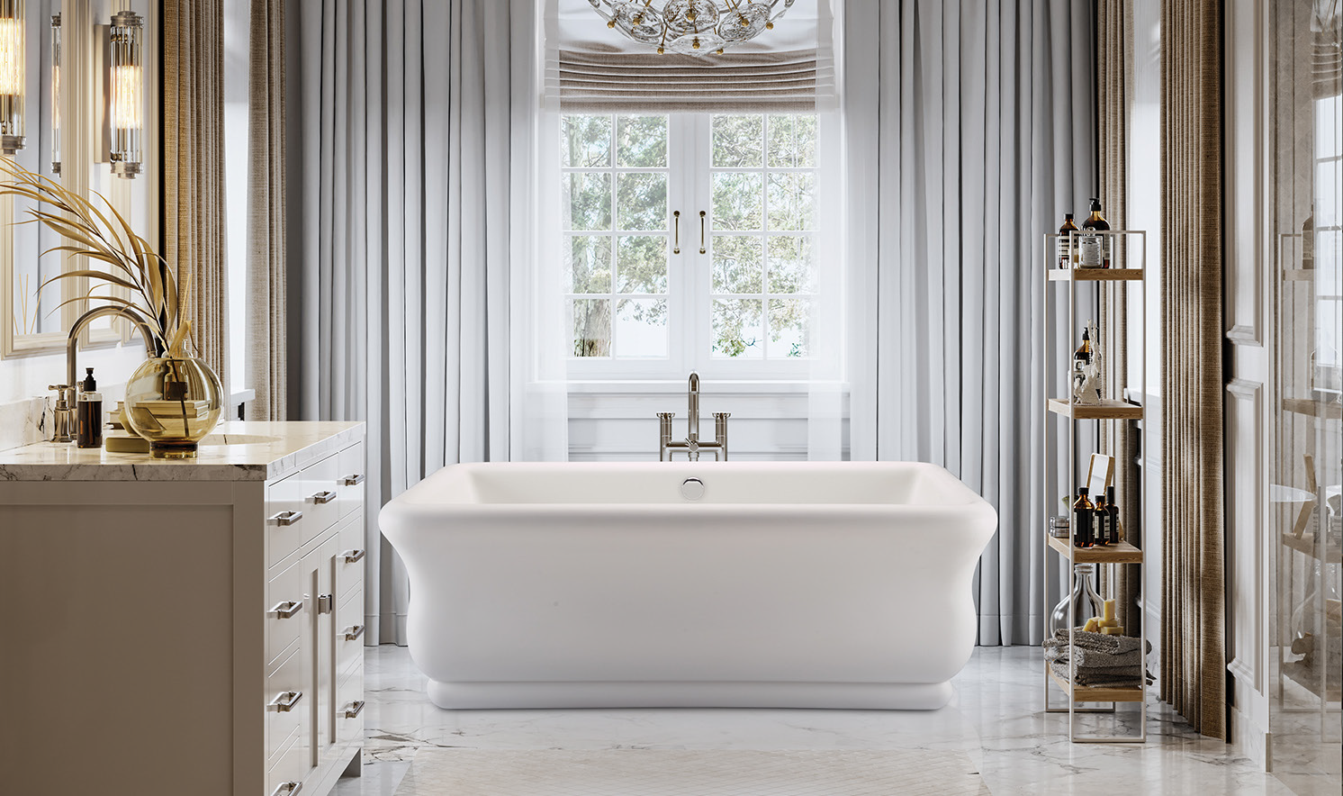 The new material is currently available on the manufacturer’s Designer Collection freestanding tubs and low-profile shower bases. Each one is made from a thick slab of specialty polymer blended ground minerals, which is prepared and thermoformed with a mold before being enhanced and finished through additional processes, including hand finishing.