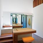 Each of the children’s bedrooms connects sleeping and bathing areas with a limestone surface that architect Paul Masi conceived as a “seamless element that sort of snakes through the room.” Beginning as a counter at the head of the built-in bed, it jumps up to form a desktop that segues to a sink counter. In the son’s suite the counter ends at a walk-in shower; in the daughter’s it turns a corner and drops to form the tub deck. A sliding barn door provides privacy, with a horizontal slot cut into the door neatly accommodating the counter’s profile.
