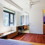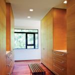 Northwest Peach Farm’s master bathroom also occupies a generous volume, and it, too, employs a simple motif to delineate functional areas without dividing the space into separate chambers. A freestanding makeup counter helps define the bathing area, its steel-framed mirror echoing the windows used throughout the house. A second counter, opposite the first, backs on a double shower framed in a glass-and-steel assembly sourced from the company that supplied the house’s exterior windows and doors. Another glazed steel door allows daylight into the toilet compartment. Limestone counters top the red cedar cabinets, while extra-small mosaic tiles lend a crisp rhythm to floors warmed by hydronic radiant heating. A flow-through dressing area separates the bath from the bedroom.