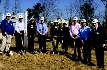 HELPING OUT: At the Atlanta-area groundbreaking were, from left: James Huffman, JWH+N; David Chatham of Chatham Holdings; Karissa George of JWH+N; JWH+N CEO Terry Russell; Canton Councilmember Wally Fowler; Canton Councilmember Jo Ellen Wilson; City Manager Bill Werner; JWH+N’s Allen Davis; and John Weiland, JWH+N. The idea is that the builder’s suppliers will deliver much-needed materials such as insulation, doors, and paint to a rented warehouse in the New Orleans area. The builder will then distribute the products to the police officers not at retail price but at the price secured through local and regional contracts. Moreover, Wieland says the company may end up subsidizing an electrical company to provide fair prices for services.
