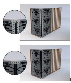 The ForceField system uses wood sheathing panels laminated with a proprietary air and water barrier to provide a code-compliant alternative to traditional house wrap systems. The Corner Seal is designed to be installed directly onto the ForceField sheathing panels.