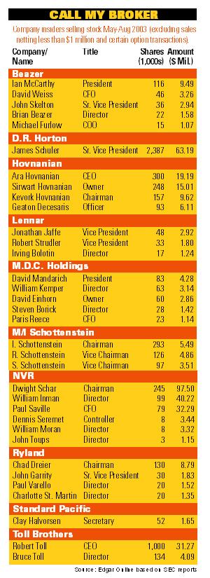 The reports drive analysts like Carl Reichard nuts. Reichard, a home building equity research analyst at Wachovia Securities in San Francisco, sees the reports of insider selling as an overreaction. He notes that virtually all of the selling has been by people who are, even after the sales, still heavily invested in their companies. “Public home builders are still fairly deeply owned by the founders who launched the companies,” he says. “As long as the founders and chief executives still have a significant portion of their wealth invested in their companies, you can’t begrudge them taking some earnings now.”
