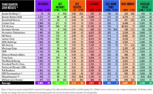 However, home prices, which were up virtually across the board (by a median 11 percent) resulted in record backlog values for at least eight public builders, fueling optimism for the last quarter and 2005. D.R. Horton’s “double-digit sales increase” and “record $4.6 billion backlog” position the company “for a strong start to fiscal year 2005,” stated chairman Donald Horton. And Brookfield Homes president and CEO Ian Cockwell, citing an anticipated year-end backlog of “30 percent of our planned 2005 closings,” expressed “confidence in our ability to deliver continued earnings growth, despite the possibility of slowing housing markets and price escalation.”