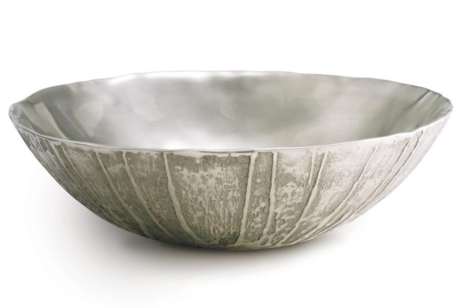 The raised relief on the Coimbra Bronze Vessel recalls Portuguese artistry of the 15th and 16th centuries, a tactile contrast to the polished 16 1/2-inch-wide interior. The bowl comes in traditional or white satin bronze finishes. Kallista. 888.452.5547. www.kallista.com.