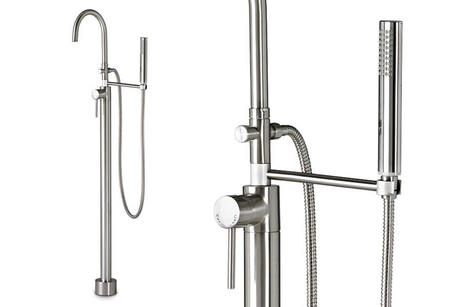 This contemporary floor-mount tub filler stands straight and sharp, giving modern freestanding tubs a statuesque companion. A single-control actuator, equipped with ceramic cartridges to prevent drips, keeps operation simple. Available in polished chrome and brushed or platinum nickel finishes, an integrated hand shower extends by way of a 5-foot-long decorative metal hose. Jado. 800.227.2734. www.jadousa.com.