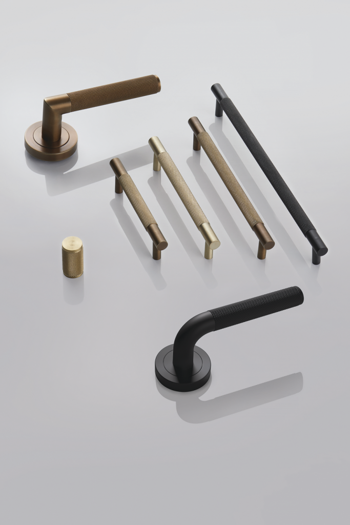 Designer Doorware presents its own take on industrial design with the KAMEN hardware collection of levers, cabinet knobs and pulls, which features a knurled pattern across most of its slim, cylindrical surfaces.
