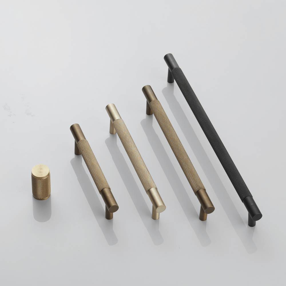 The Luxe Modern Leversets collection includes three knurled and two reeded handle styles, pictured above.