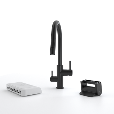 The all-brass Konrad kitchen faucet offers a sleek, modern aesthetic, operable either via integrated hand lever or the manufacturer’s foot pedal system, which allows users to control the faucet without touching it directly. Tapping the pedal once will enable continuous water flow for up to two minutes or until the pedal is tapped again. The Konrad is available in a chrome, brushed nickel, or matte black finish, and features a high-arch spout with 180 degrees of rotation, as well as a pull-down sprayhead. principlefaucets.com