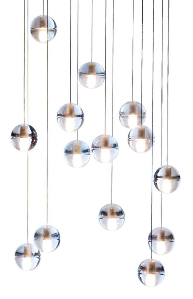 The longest cast-glass sphere suspended from the 14.14 chandelier fixture hangs 10 feet from a powder-coated canopy. Each sphere houses a 1.5-watt LED lamp in a frosted cylindrical void, and each pendant plugs into the round or rectangular canopy via a headphone jack connection. Fixture configurations range from the 14.1, which includes one pendant, to the 14.36, which flaunts 36. Bocci. 604.639.5184. www.bocci.ca.