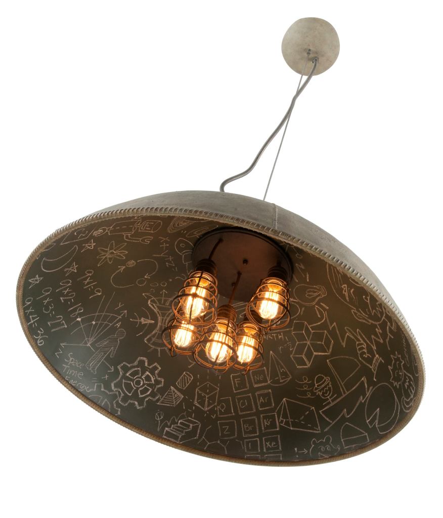 Get schooled in the art of creative interior lighting with a whimsical light fixture that doesn’t hide its industrial edge. The Relativity pendant by Troy Lighting was inspired by the work and era of Albert Einstein. Its hand-formed iron-and-rebar shade is finished with salvaged zinc for a rustic matte look and is suspended from a cable wire. The lamp’s interior resembles a chalkboard compete with hand-drawn mathematical equations and illustrations while metal cages—a reference to early electric lamps—cover the bulbs. The pendant is available with five, four, or three bulbs; a one-blub sconce is also available. Troy Lighting, www.troy-lighting.com; 626.336.4511.
