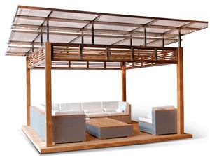 Shown here, the EarlyBird gazebo combines stainless steel with teak from sustainable and protected forests. The gazebo measures 178.74 by 178.74 by 125.98 inches and is topped by three flat roofs made of canvas designed for the outdoors. Custom lighting can be added.