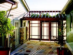 This urban home sits on a wedge-shaped lot facing two busy streets. A single-story floor plan fills 2,500 square feet of the tight lot, so there isn’t much left for outdoor enjoyment. “We wanted to protect ourselves from the noise and danger of the street,” says homeowner/ architect Michael Antenora, “and capture most of the yard for private spaces rather than public ones.” A fence borders three sides of the house, producing three separate courtyards that can be connected by opening up both ends of a central breezeway. “Rather than closing us in, the fence makes the house feel larger because we’ve extended the living spaces.”