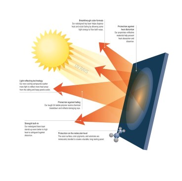 New cooling compounds in the middle layer scatter light energy to reflect more heat. “That [second] layer is designed to do a very good job of reflecting infrared energy. And it can get back out of the exterior cover layer, because if you reflect that infrared energy, you keep the panel cooler,” says Parks.