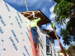 The use of the panelized building components provided many benefits for combating the extreme weather, sounds and earthquakes. They found that the panelized system was so strong on its own that in many areas of the home it did not need exterior wood sheathing. However, this was a challenge when it came time to select a weather resistive barrier for the home. The team found that many of the weather barriers on the market are designed for application to wood sheathing only. Thus, a new type of weather resistive barrier was needed.