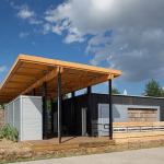 Shaded by bifacial solar panels that collect reflective light from underneath as well as direct sunlight that shines above, the OMs can be configured in various ways to provide protection from harsh mountain weather while still allowing cool breezes or warming winter sun to maintain pleasant conditions on the porch as well as inside the main house.