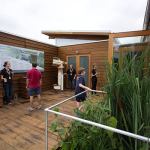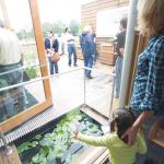 Visitors walk past a wetlands garden to reach the concealed cour…