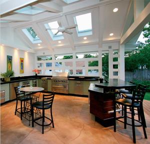 This outdoor kitchen stands alone as a full-service room where the homeowners can cook and entertain al fresco for most of the year. They are aided by a full suite of epicurean amenities, including a gas grill with side burners and warming drawers, under-counter fridge, ice maker, and an insulated ice cooler built into the countertop. The wet bar island is made from Brazilian mahogany hung on a steel frame and topped with stained black concrete. “It could probably be hit by a truck and survive,” jokes builder Wayne Magee. Hot and cold water along with radiant heat extend the outdoor season and are concealed in the concrete slab floor, which is stamped to look like flagstone. Skylights along the roof ridge have rain sensors so they can be left open all summer for ventilation without worry of a sudden downpour.