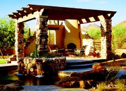 Sited next to the swimming pool, the ramada’s stone foundation seems to emerge from the water. Scuppers in the rock wall carry water into the pool, relieving the desert heat with the cool sound of splashing water. The stamped and colored concrete ramada floor spills out to become the pool deck, unifying the elements of this imaginative backdrop for entertaining. Designer/Builder: Calvis Wyant Luxury Homes, Scottsdale, Ariz.; Photographer: Mark Boisclair.