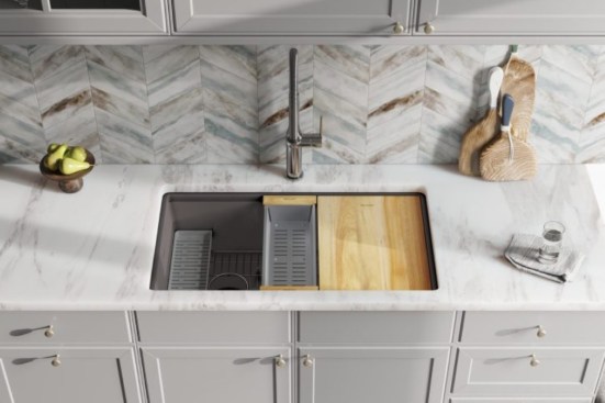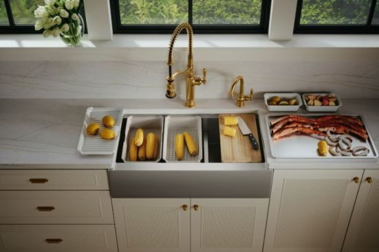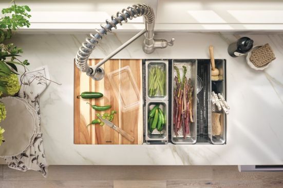 Workstation sinks with food prep and serving areas are becoming popular this year, according to 83% of industry pros in the NKBA 2025 Kitchen Trends Report. Over the next three years, 71% say workstation sinks with tiers for cutting boards and accessories will be the most popular sink configuration.