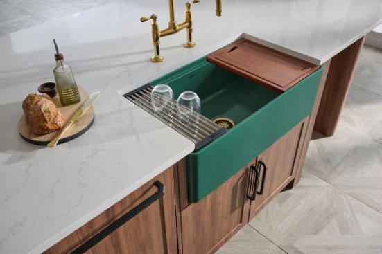 Infusing color into the kitchen, Ruvati’s Fiore workstation sink is available in emerald green. The handcrafted fireclay sink dramatically expands kitchen functionality with integrated ledges along the front and back of the sink to support useful accessories. Each sink includes a cutting board constructed of African Mahogany that fits neatly atop the basin, a protective bottom rinse grid, and a patented, foldable drying rack perfect for drying dishes. Other optional accessories include a mixing bowl with platform and a condiment serving tray. ruvati.com