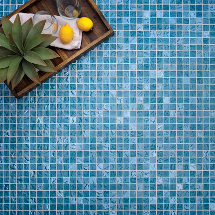 The Lava Glass mosaic tile series is defined by undulating, iridescent surfaces that evoke the look of light through water, designed for use in pools, showers, and other water applications. The tiles meet or exceed all industry requirements for submerged applications and exterior freeze-thaw environments, and they feature durable back paint, applied at over 1,025 degrees Fahrenheit, that provides the tiles’ pearlescent color.