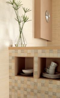 Achieving textures using Inkjet technology, Singular tiles come in a 31.6-by-45-centimeter size in pearl, beige, almond, and petroleum. The covering has two listellos, also in mosaic, available in 10-by-31.6-centimeter and 5-by-31.6-centimeter sizes. Grupo Halcón. www.halconceramicas.com