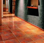 Created in a process that uses ceramic glazes like printing inks, Metro porcelain tiles feature the graphic image of a heavily rusted metal surface. The coppery russet color is broken by steel-blue splotches and streaks for a corroded industrial look. Imagine Tile. 800.680.8453. www.imaginetile.com