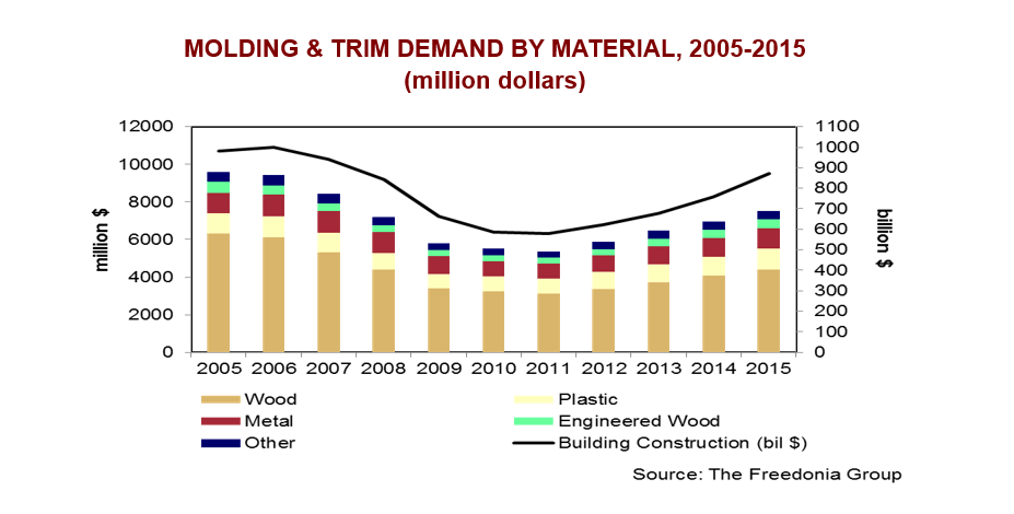 Wood trim, however, will still dominate the overall trim and molding market. The Freedonia Group predicts wood molding and trim will grow 5.7% each year until 2020, reaching $5.8 billion that year. Most of these gains will be a result of the commercial construction market, not residential.