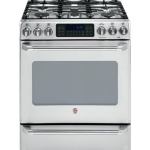 Part of the company’s Café series, the 30-inch unit comes with five burners, including one that delivers 17,000 BTUs. It offers a baking drawer, a true-convection oven, and a self-clean function. It's priced at $2,100. GE.