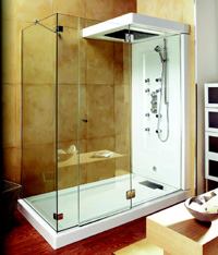 The 6036 S model shown measures 60 inches long, 36 inches wide, and 90 inches tall and features the MAAX IES ¾ shower system with the Rainmax showerhead integrated into its roof cap. The shower system’s ¾-inch, four-function thermostatic valve controls eight adjustable body jets and the three-mode handshower. Maax. 800.463.6229. www.maax.com