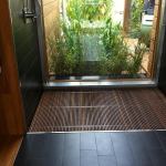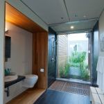 A large window in the bathroom offers a view to the outdoors, while an on-site wetland helps filter and recycle greywater from the shower, clothes washer, and dishwasher.