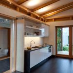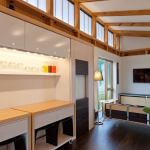 The open living space includes student-designed flexible furniture such as the rolling island/dining table/side board pieces.