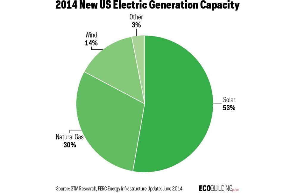 According to the SEIA’s report, this benchmark growth is thanks to three consecutive quarters in which more than 1 GWdc was installed across the nation. In the second quarter, this meant a 21% increase in installed PV over the second quarter of 2013. Solar installations beat all other forms of energy production for the most installed capacity in the quarter with 53% of new generating capacity from solar power.
