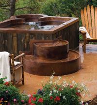 This custom copper spa features recycled barnboard skirting and two loungers. Spas also come in stainless steel and feature custom jet placement, swim flow systems, individual cradling seats, exercise areas, and more. Diamond Spas. 800.951.7727. www.diamondspas.com.