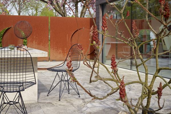 Charles and Ray Eames’ iconic 1951 design has a new life outdoors, thanks to the addition of powdercoated finishes in black, gray, and cream by Swiss furniture maker Vitra. Made of bent and welded steel wire, the Wire Chair’s seat and back are supported by a four-legged base with cross struts. An indoor version of the piece includes a chrome-plated finish and leather and hopsack upholstery.