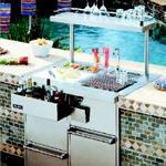 The maker’s 41-inch-wide Outdoor Refreshment Center incorporates a variety of work features, including a sink with a pro-style faucet, a storage trough for large containers, and a sliding ice bin. Other accessories include a high shelf, speed rail, cutting board, stainless steel condiment bins, and storage drawer. Viking. 888.845.4641. www.vikingrange.com.Circle 22