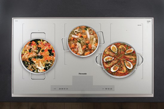 Thermador’s liberty induction cooktop features 11 inductors divided into 3 cooking zones, each able to accommodate large pots and pans. The HeatShift and MoveMode technologies control the power level of the cooktop and transfer cooking settings to a new location within the surface’s vertical rows as pans move around. The cooktop can be heated to five pre-set temperature levels, and once the pan reaches the target temperature, a sensor can automatically control the pan’s temperature.