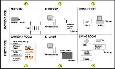 The basic configuration is for a two-story home with a structured wiring panel located in the laundry room that includes a cable modem, an Ethernet switch, and a wireless router. This model also has a wireless access point located in the master bedroom.