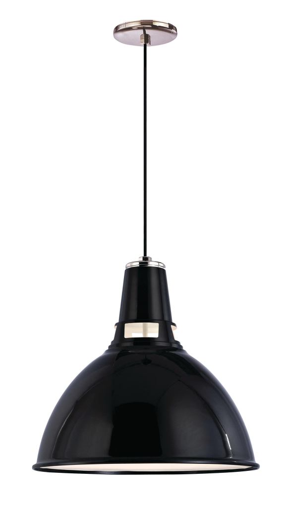 The Lydney pendant brings a refined industrial aesthetic to interior lighting. Made from polished nickel, the fixture casts a broad light beneath a shiny painted exterior, the manufacturer says. It has an unadorned canopy and is available in three sizes and three colors: black, gray, and white. Cost: $750. Hudson Valley Lighting.